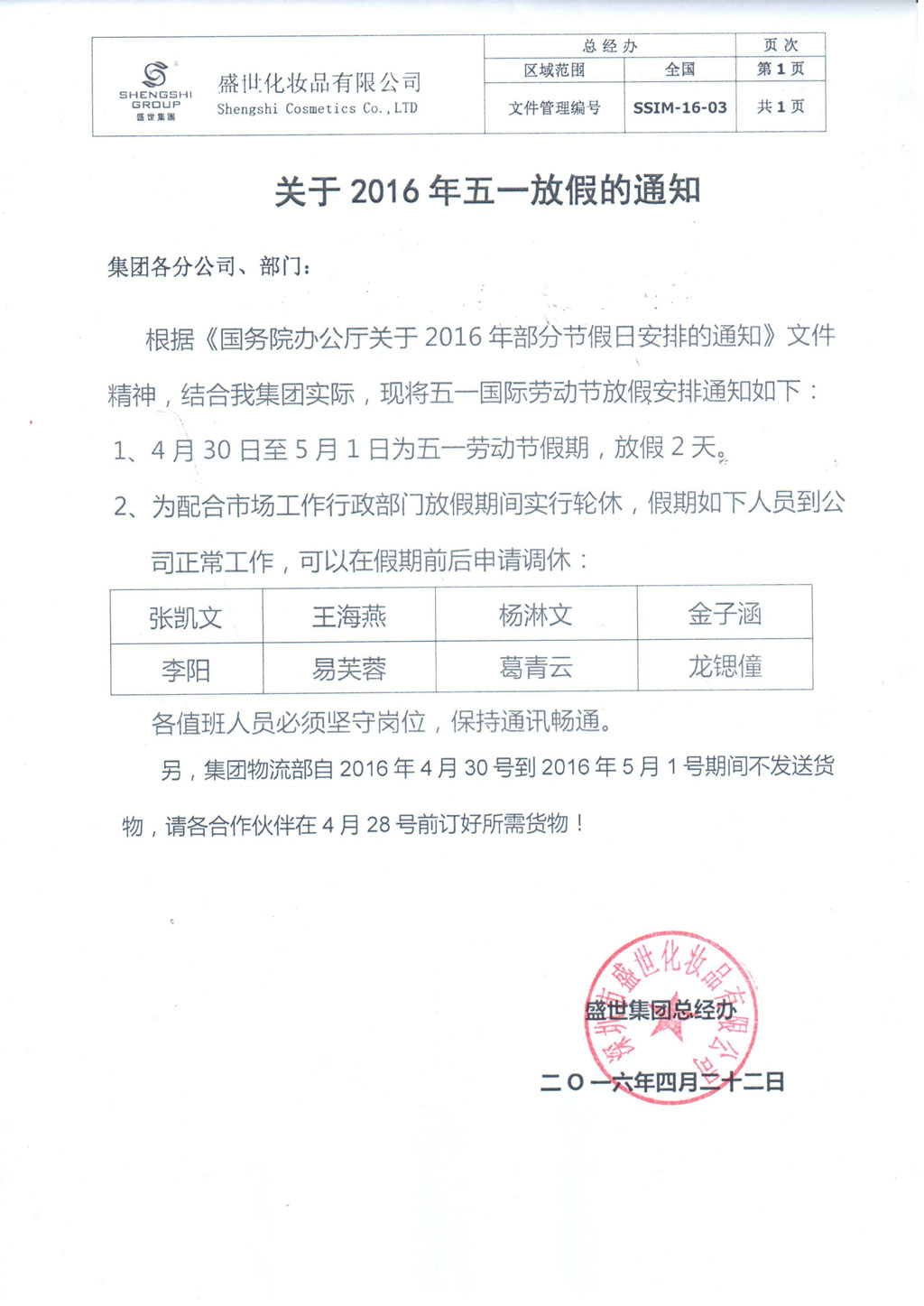關于2016年五一放假的通知